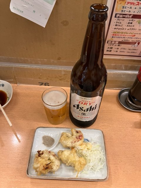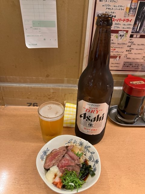 今回は、和牛たたき(550円)とタコ天(350円)、そして瓶ビール(450円)をいただきました。